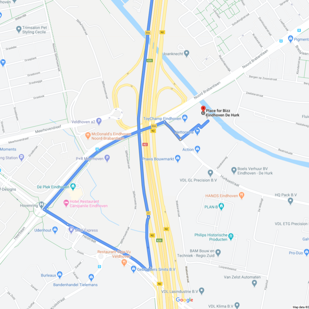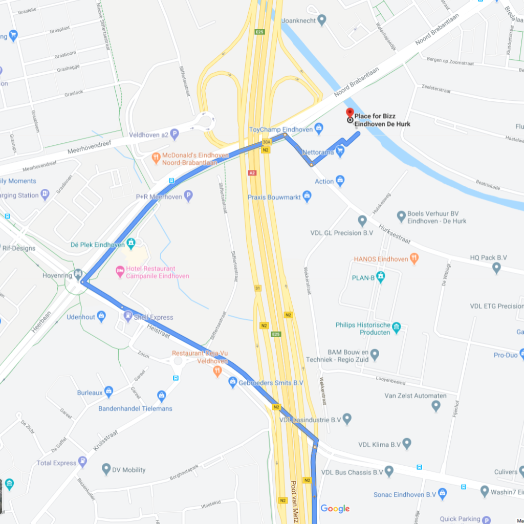 Voer Hurksestraat 64 (Eindhoven) in je navigatiesysteem in. Herkenningspunt: Beter Bed. Achter dit gebouw ga je direct links, rechtdoor door het hek is Place for Bizz, waarbinnen het Coachhuis is gevestigd.